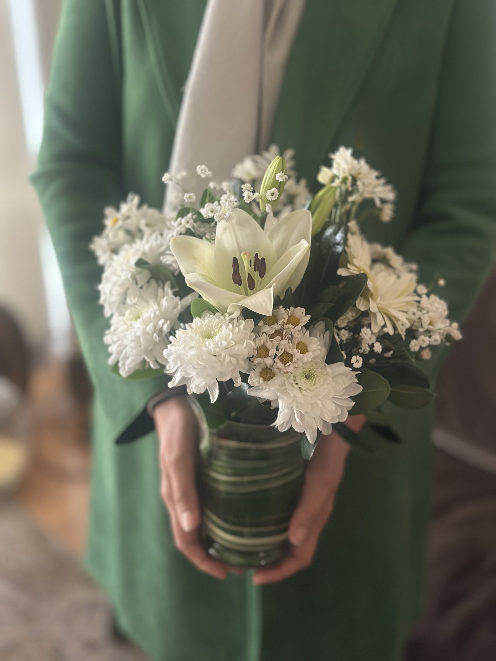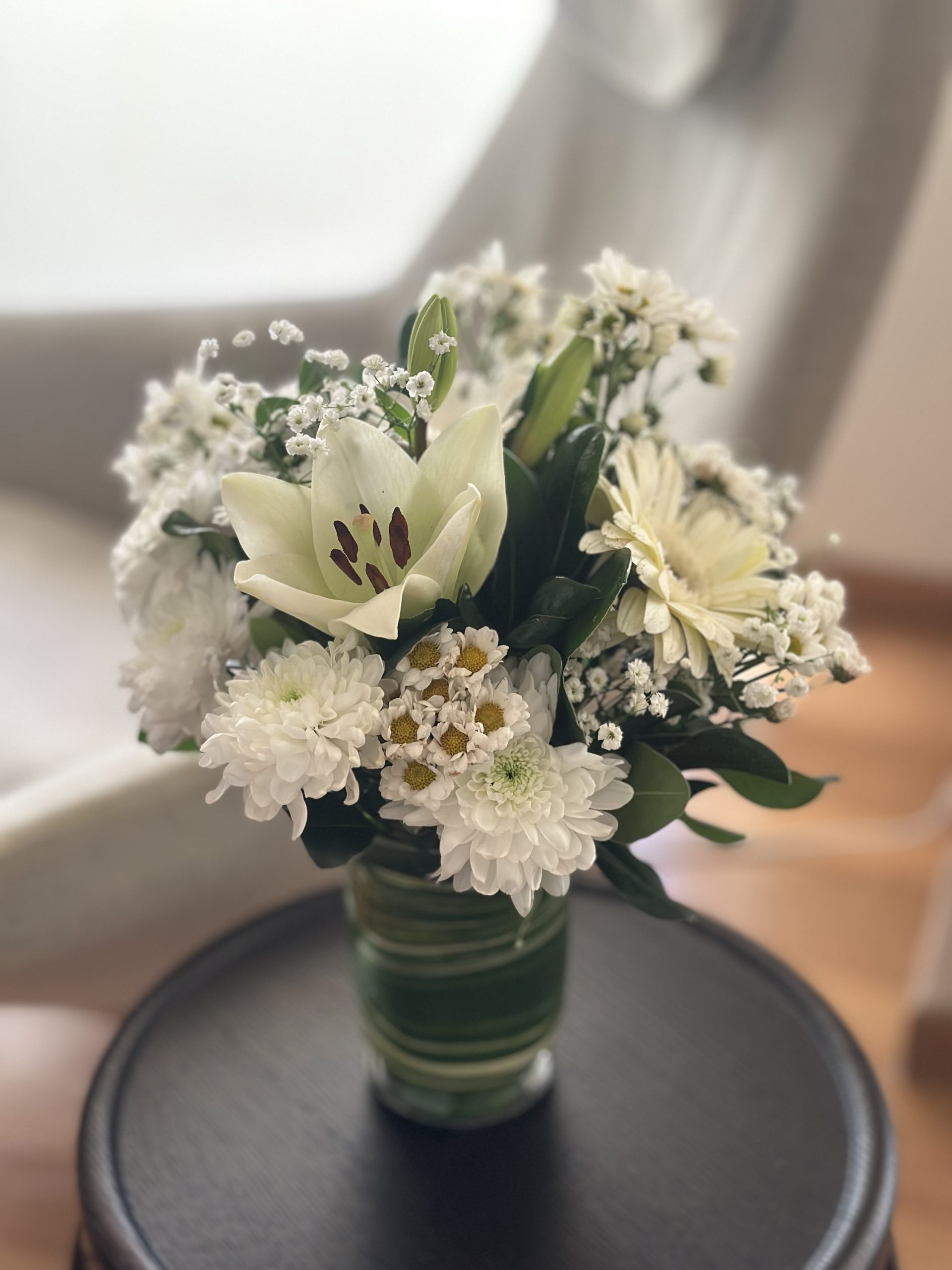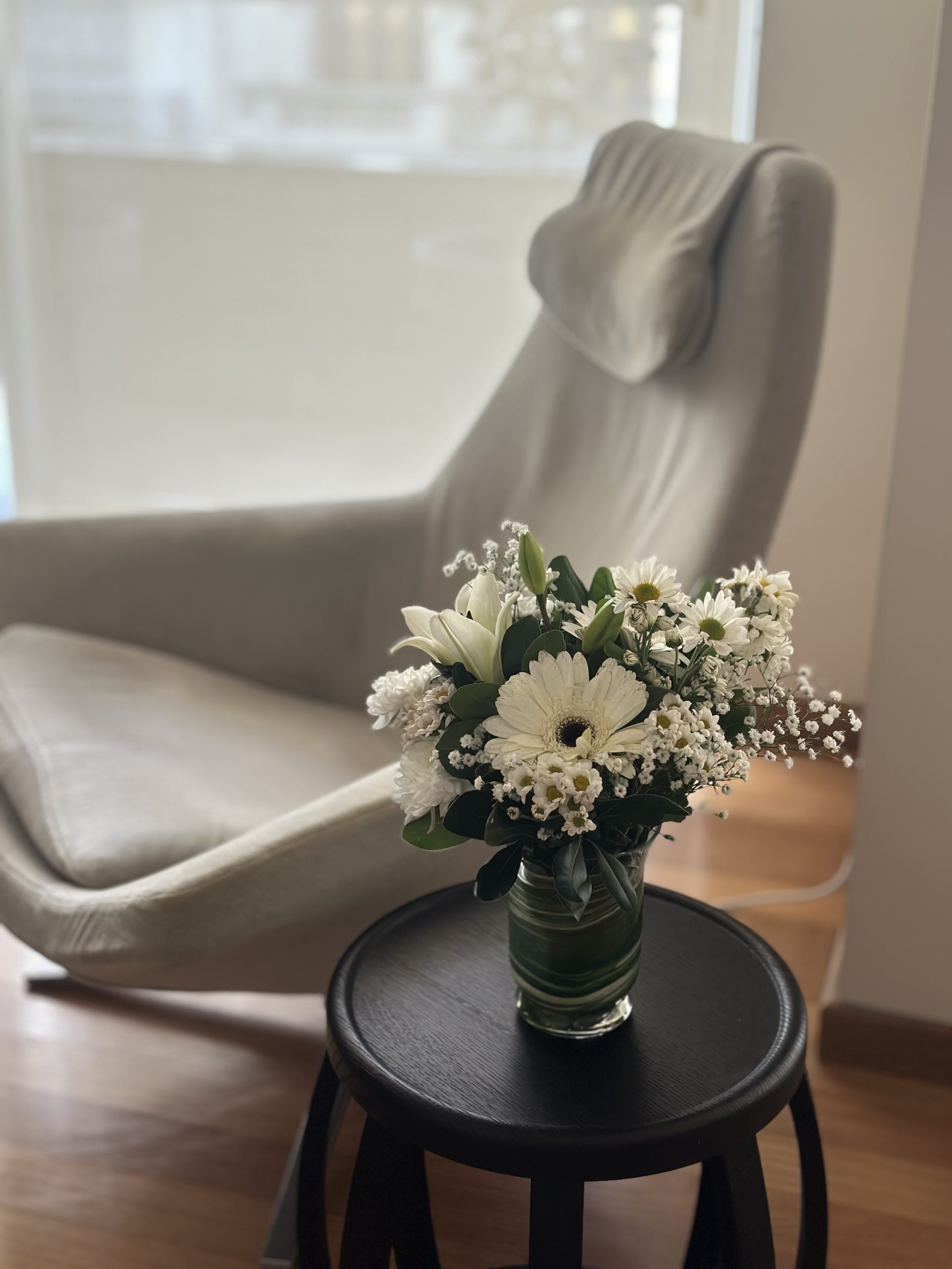 Ramo de flores blancas y flollaje en florerito de vidrio